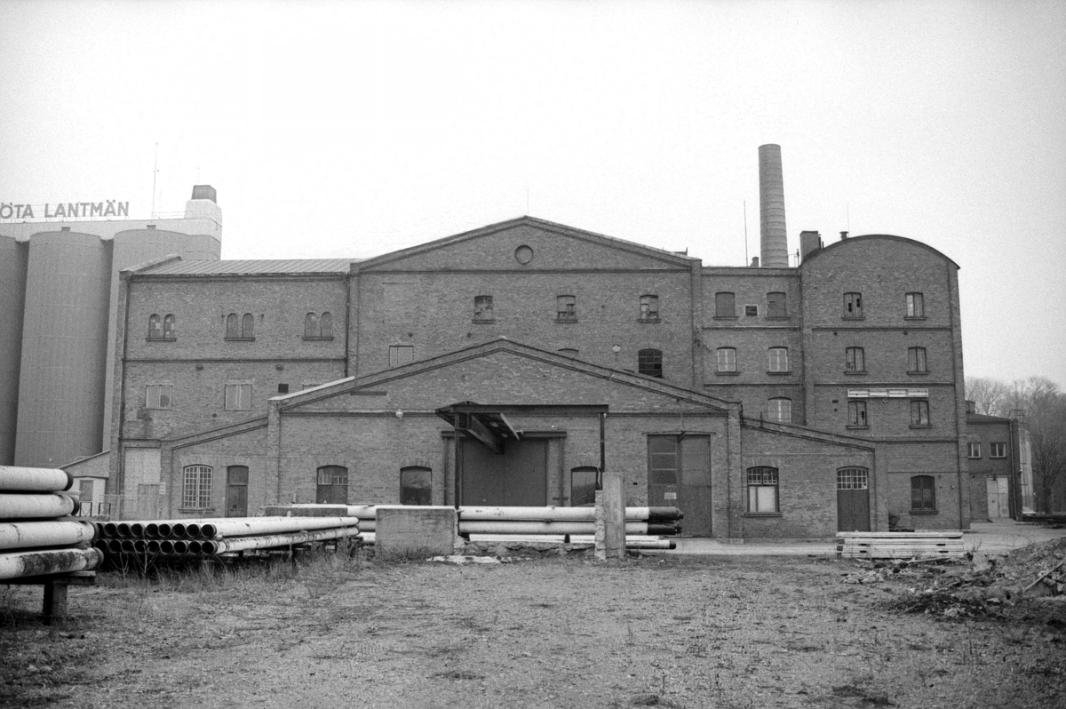 Vy mot sockerbrukets gigantiska anläggning i Linköping, som här endast visar fabrikens mindre västra fasad. Verksamheten startade 1905 och kom att bestå i nära precist 50 år. På bolagets självaste 50-årsdag meddelades nämligen att fabriken skulle läggas ned, vilket även kom att ske under verksamhetsåret 1955. Här en dokumentation från 1987, året före rivningen av anläggningen.