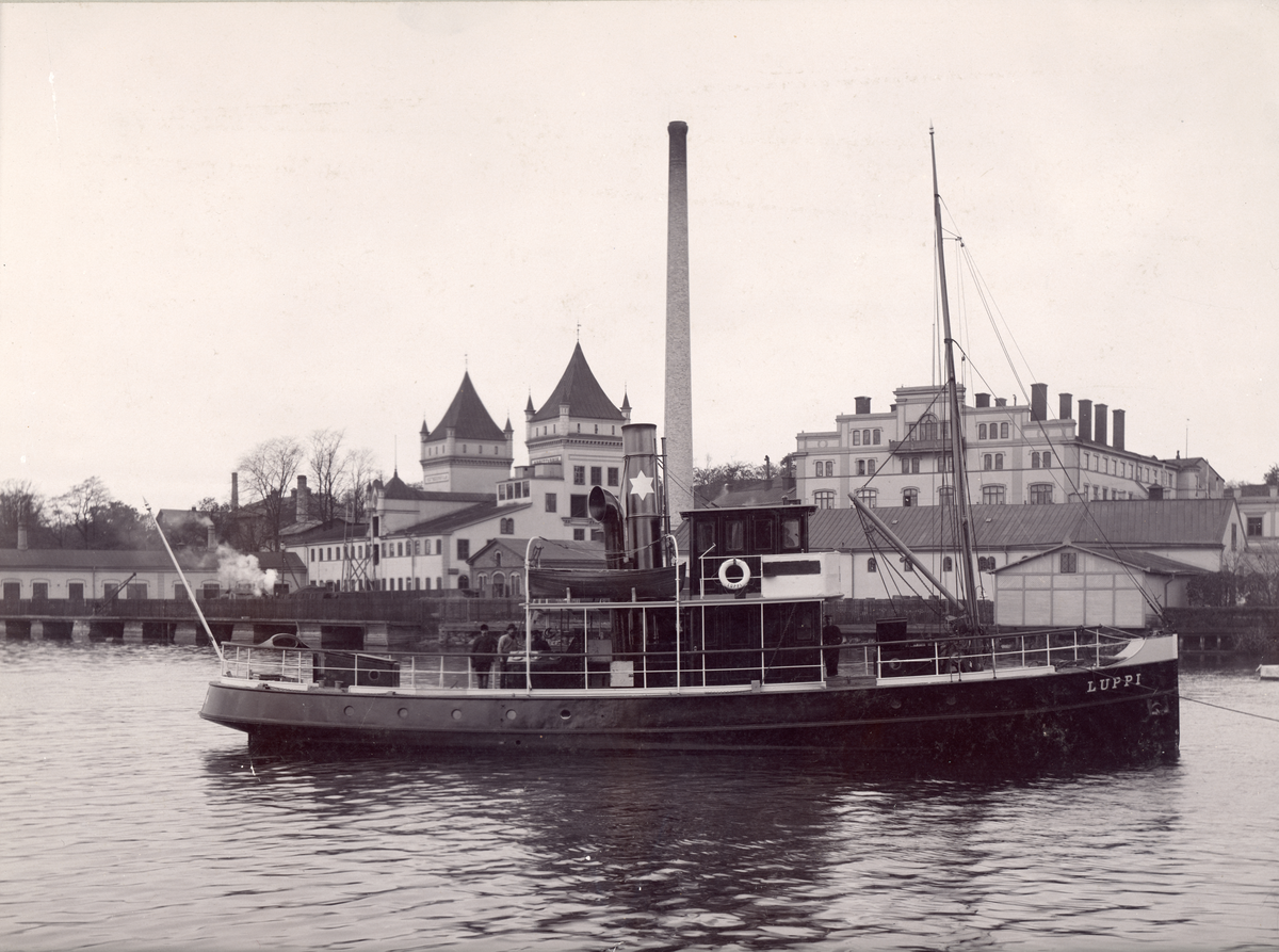 Bogserångfartyget LUPPI ligger framför Reymersholms spritfabrik. Fyra besättningsmän är synliga ombord.