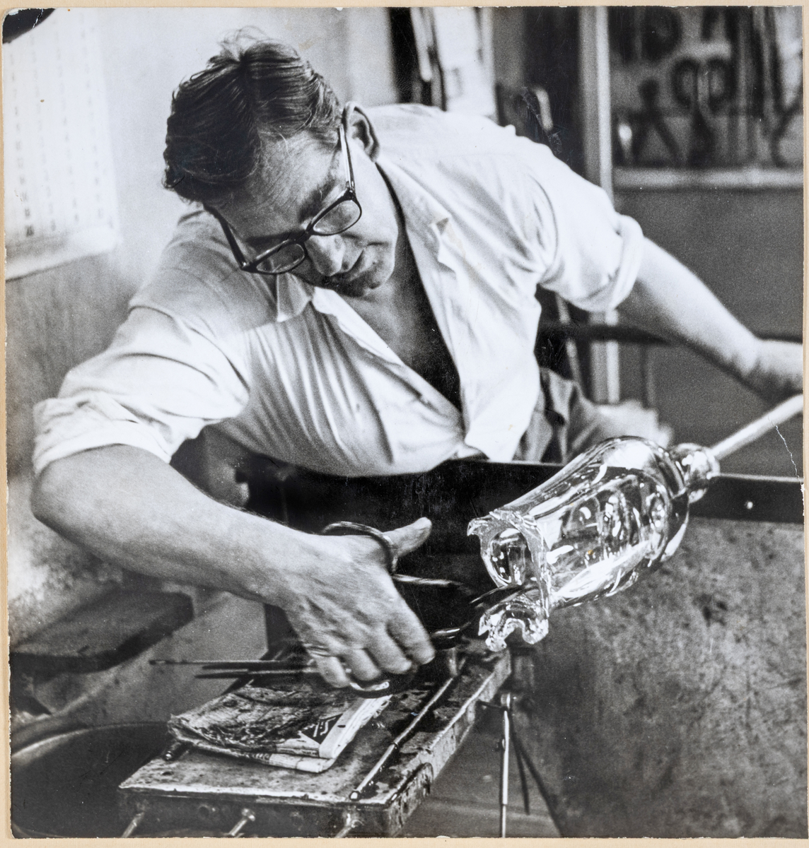 Titel: Benmakare Erik Petersson under arbete i hyttan på Strömbergshyttan.