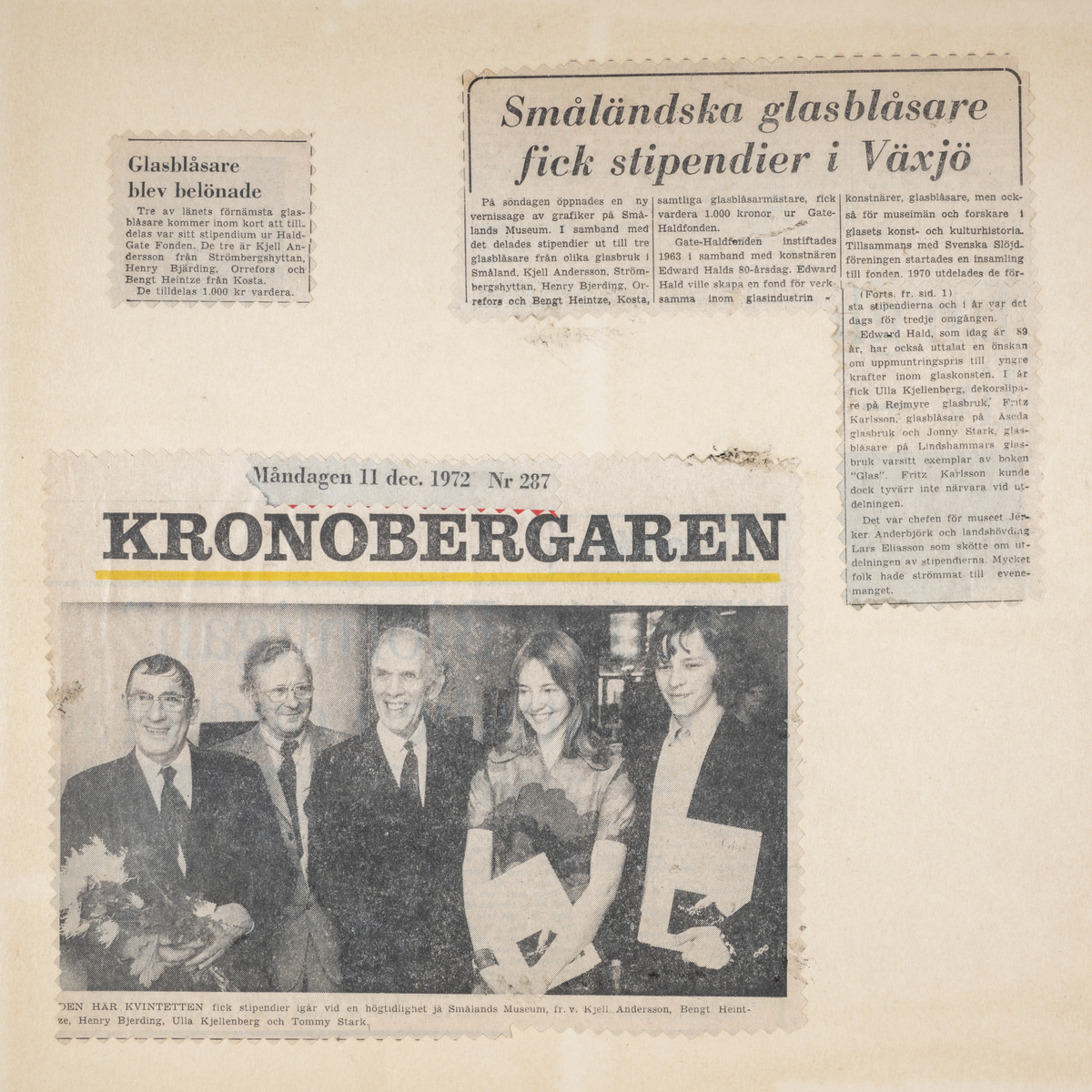 Fr.v.: Kjell Andersson (Strömbergshyttan), Bengt Heintze (Kosta), Henry Bjerding (Orrefors), dessutom Ulla Kjellenberg (Reijmyre) och Tommy Stark (Lindshammar).
