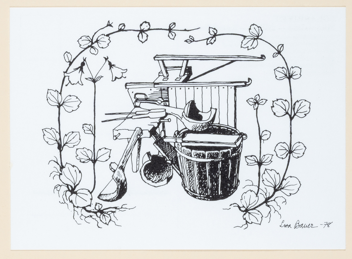 Tuschteckning med glasarbetarverktyg och linnéaslingor.