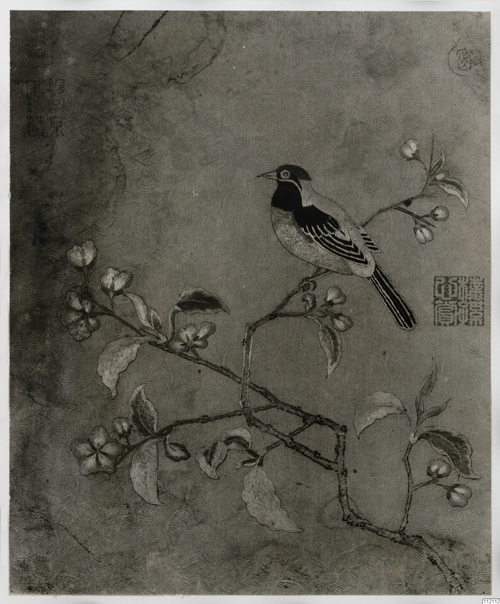 Konstverk målat av Hui-tsung. Fågel på en gren. Broderi efter en målning av honom.