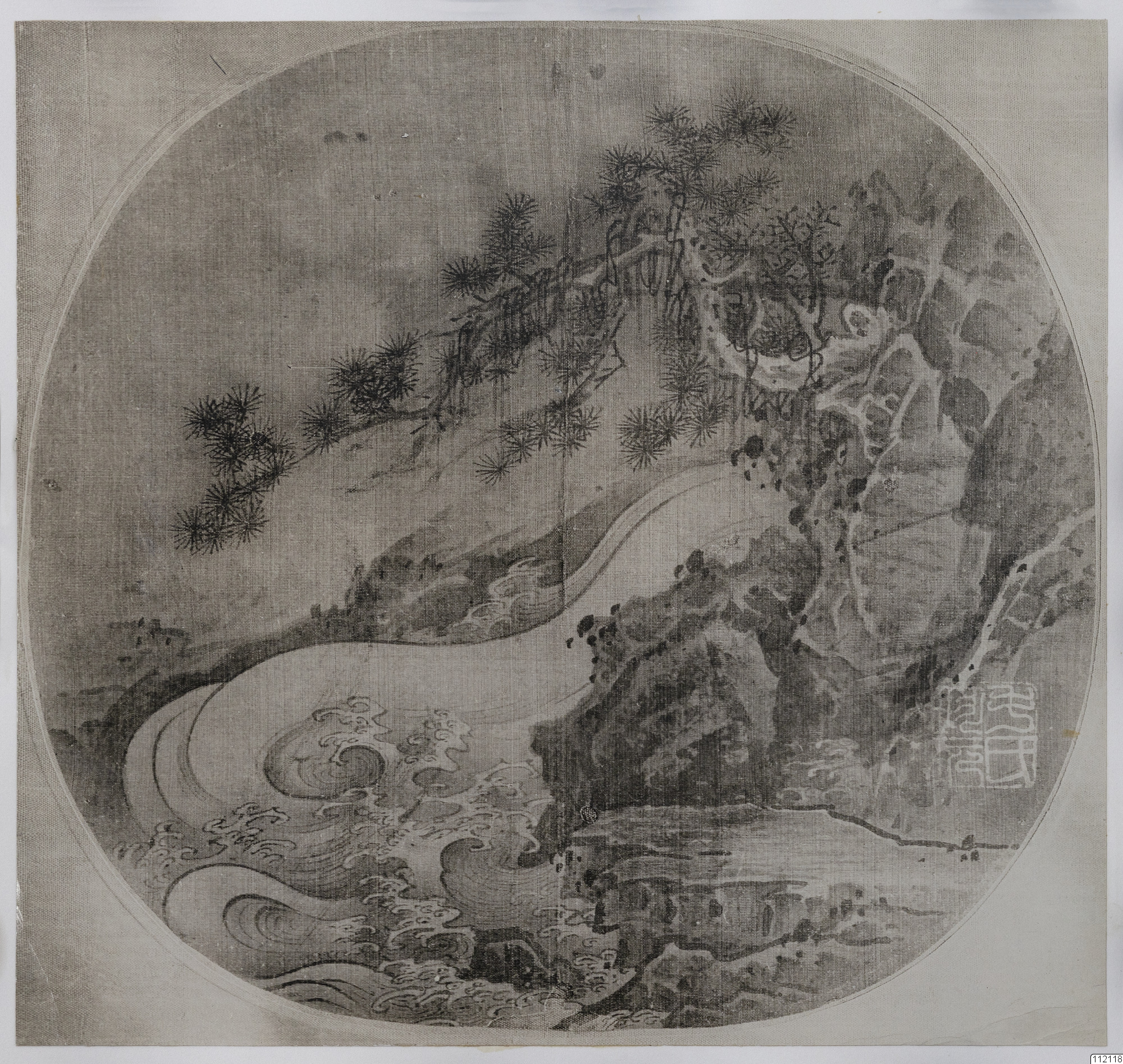 Konstverk målat av Hsiao Chao. Ett vattenfall bland tallklädda klippor. Solfjädersmålning. Senare kopia.