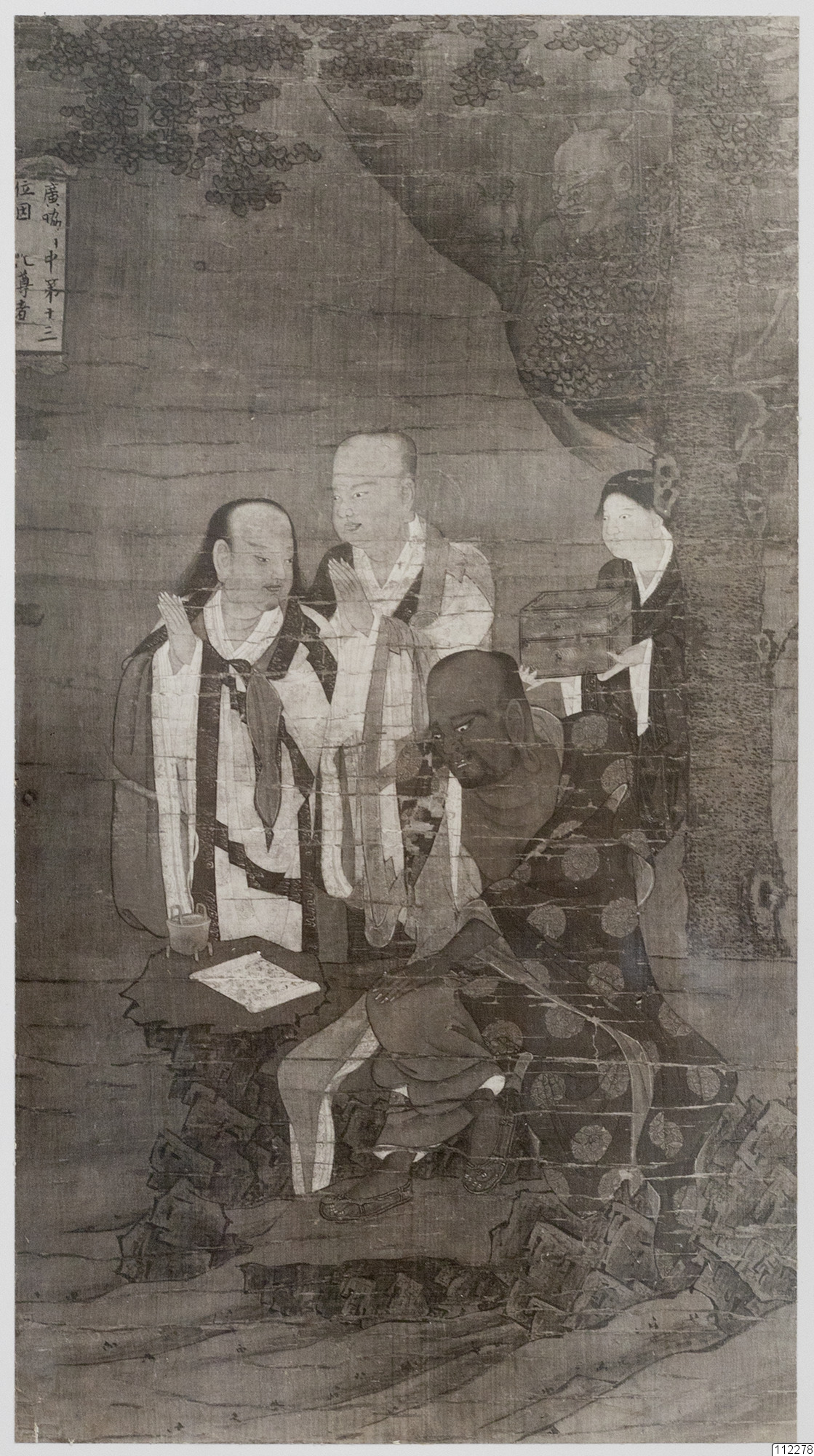 Konstverk målat av Lu Hsin-Chung som avbildar den första arhaten som förklarar en sutra.