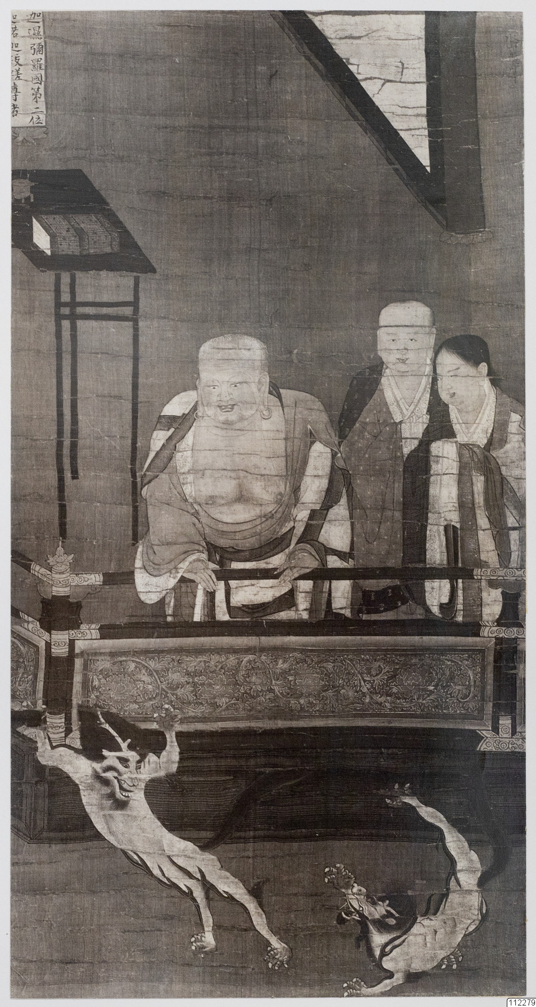 Konstverk målat av Lu Hsin-Chung som avbildar den andra arhaten som tittar på två lejon som leker.