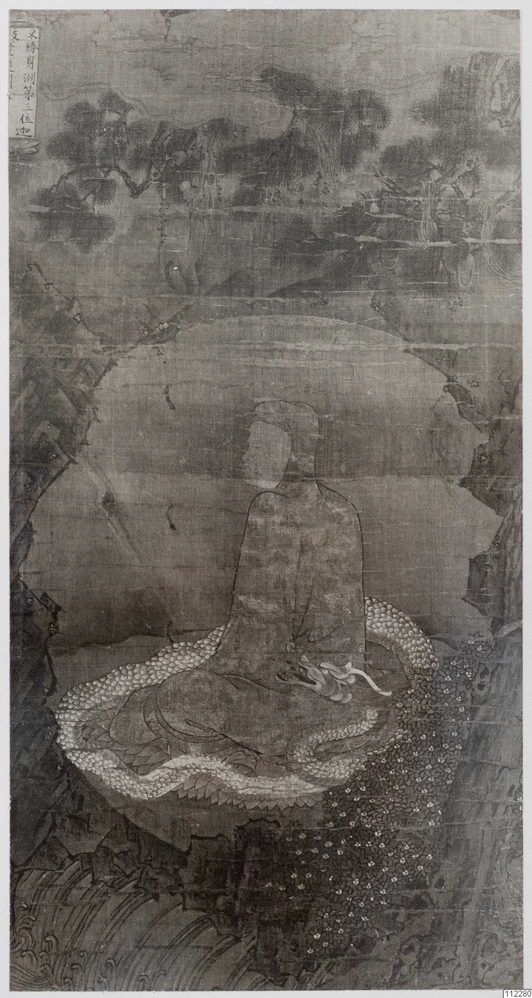 Konstverk målat av Lu hsin-Chung som avbildar den tredje arhaten som mediterar med en drake some slingrar sig runt honom.