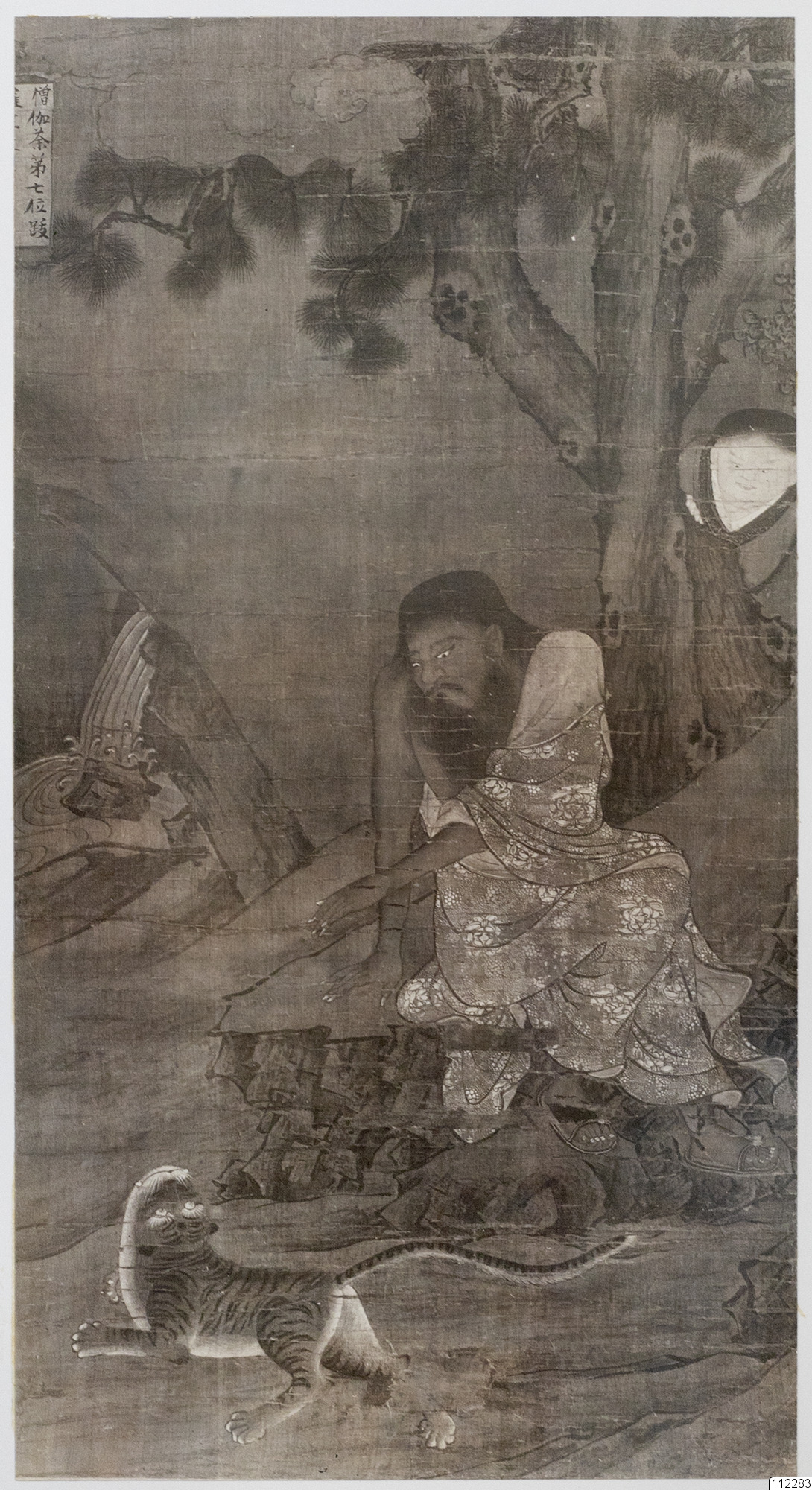 Konstverk målat av Lu Hsin-Chung som avbildar den sjunde arhaten som leker med en tiger.