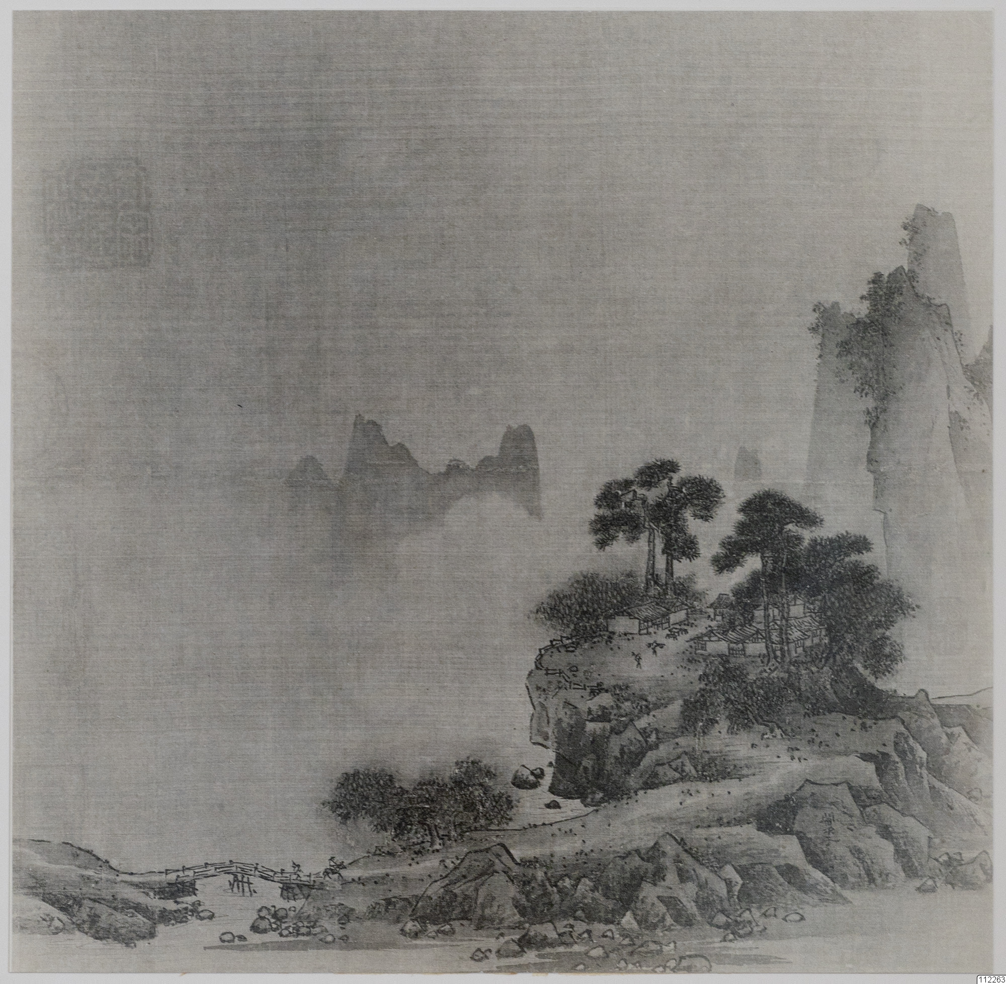 Konstverk målat av Yen Tz'u-Yu som avbildar en udde med stugor och träd.