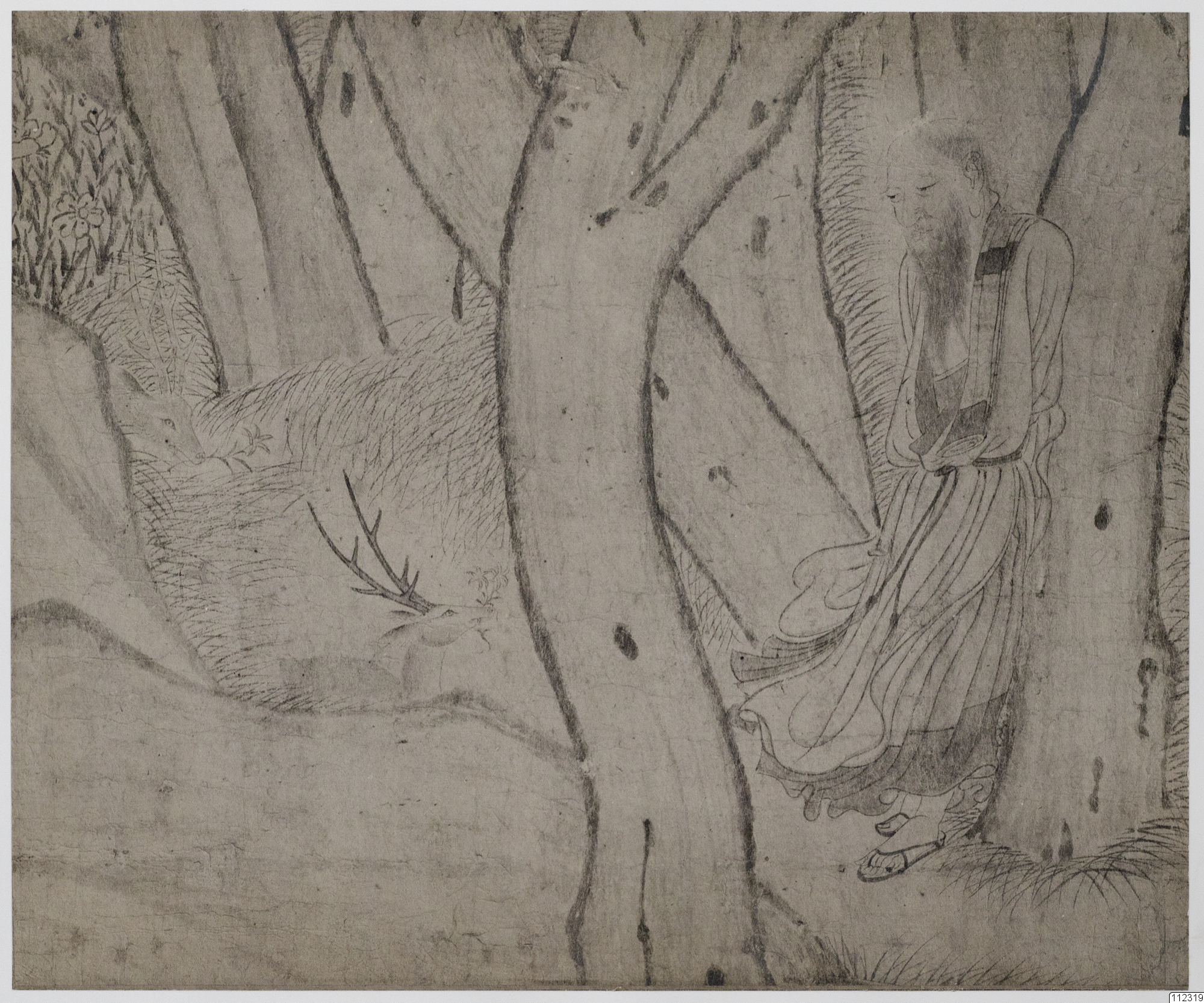 Konstverk målat av Li Kung-Lin som avbildar en vis gammal man i skogen.