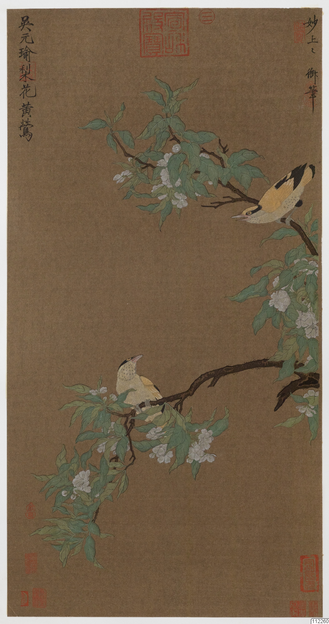 Konstverk målat av Wu Yuan-yu som avbildar två orioler på grenarna av ett blommande päronträd.