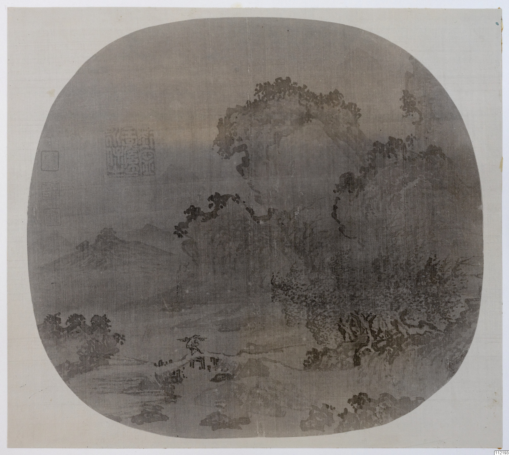 Konstverk målat av Chiang Ts'an. Dimma över dalen och en resenär på en bro. Solfjädersmålning i mästarens stil.