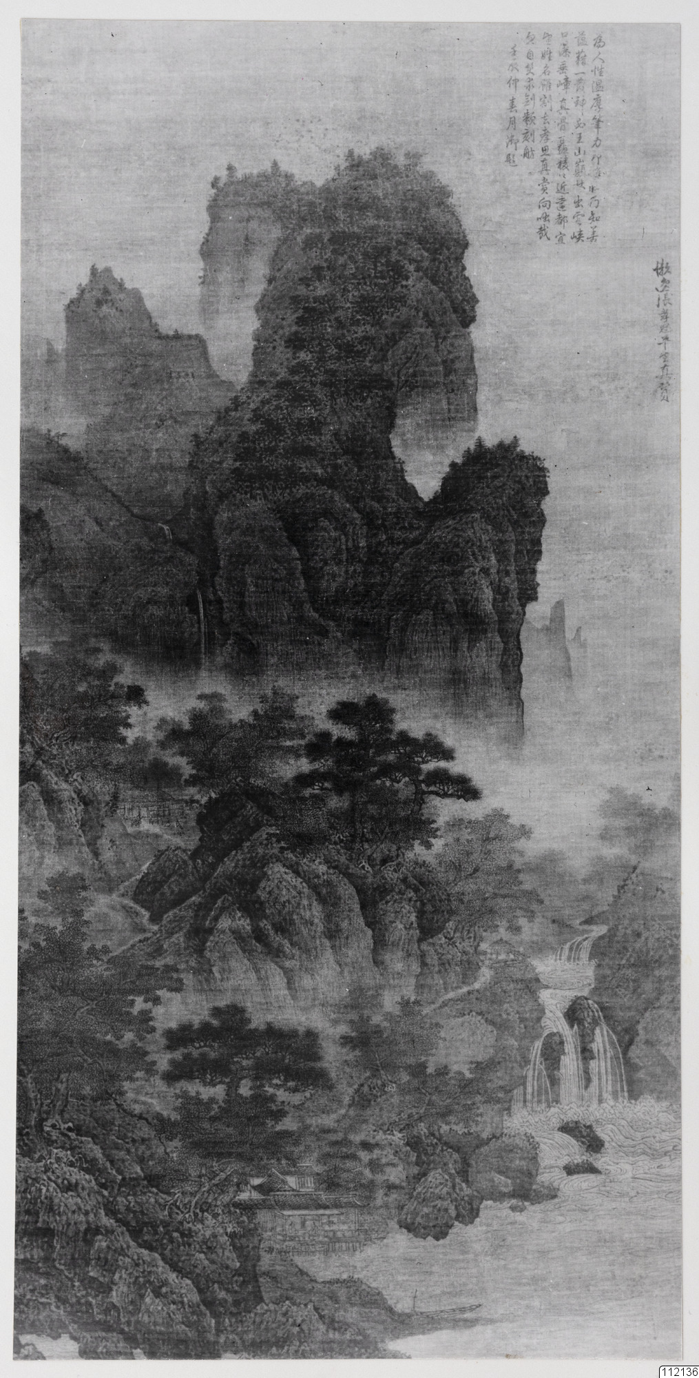 Konstverk målat av Fan K'uan. Resenärer i ett dimmigt landskap. Attr. To.