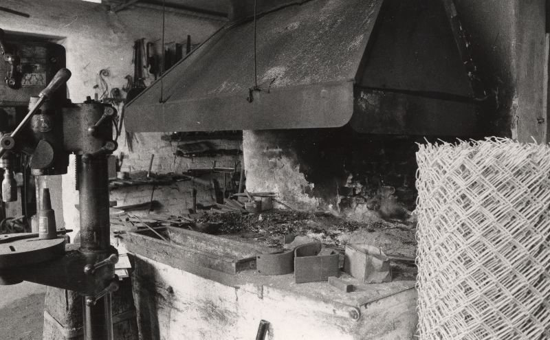 Bild av Enoch Nilssons smideshärd och andra redskap, på sidan om en stor rulle stängsel.
