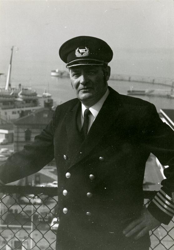 Svartvitt porträtt av Oskar Ekrot. Delar av Helsingborgs inre hamn syns i bakgrunden. Troligtvis står Ekrot på en balkong någonstans på Järnvägsgatan.