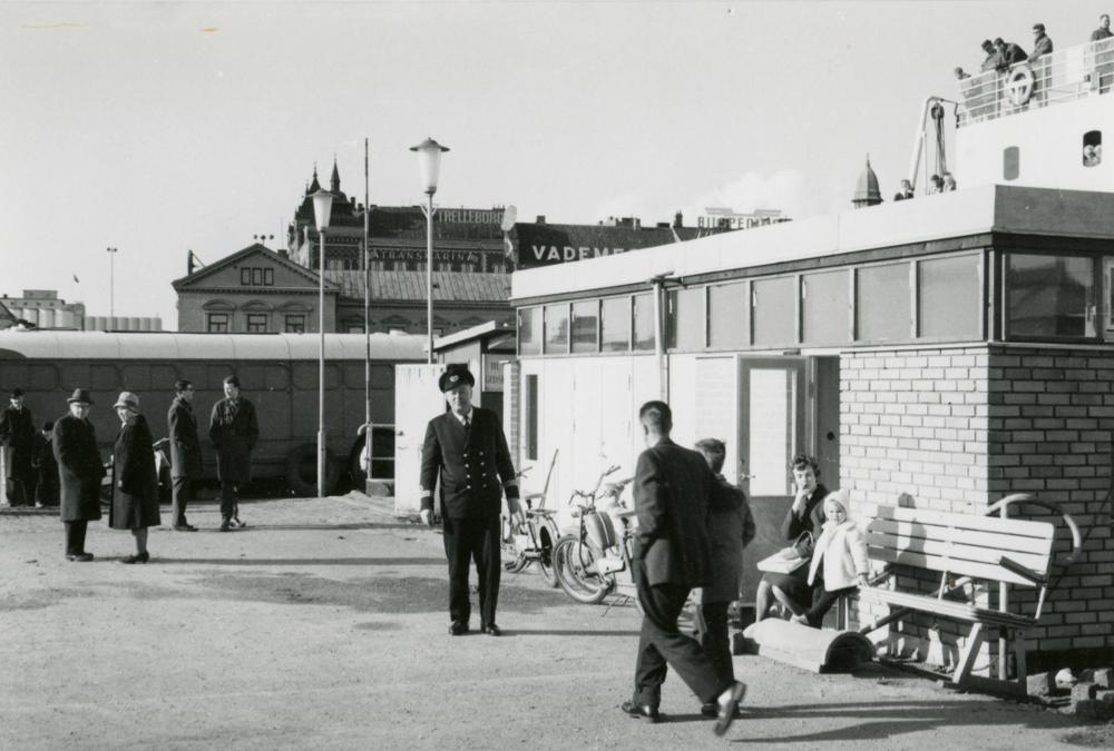 Svartvitt fotografi taget i inre hamnen i Helsingborg. En låg byggnad med platt tak syns i bildens högra del. Bakom den skymtar en del av en färja. Ett antal passagerare syns stående på passagerardäck. Framför byggnaden sitter en kvinna och ett litet barn på en bänk. Mot byggnaden står flera cyklar parkerade. På den öppna ytan framför byggnaden står en äldre man i uniform som tittar mot kameran. Mellan honom och kameran kommer två pojkar gående. Den äldre håller armen om den yngre pojkens axlar. Längre in i bild står ytterligare några personer och bakom dem står en buss. Bussen har ena långsidan mot fotografen. Bakom den skymtar tullhuset på andra sidan hamnen samt övre delen av husen som kantar Hamntorget. Fotografiet var monterat på ett tunt papper på vilket det stod skrivet "Styrman G. Henriksson".