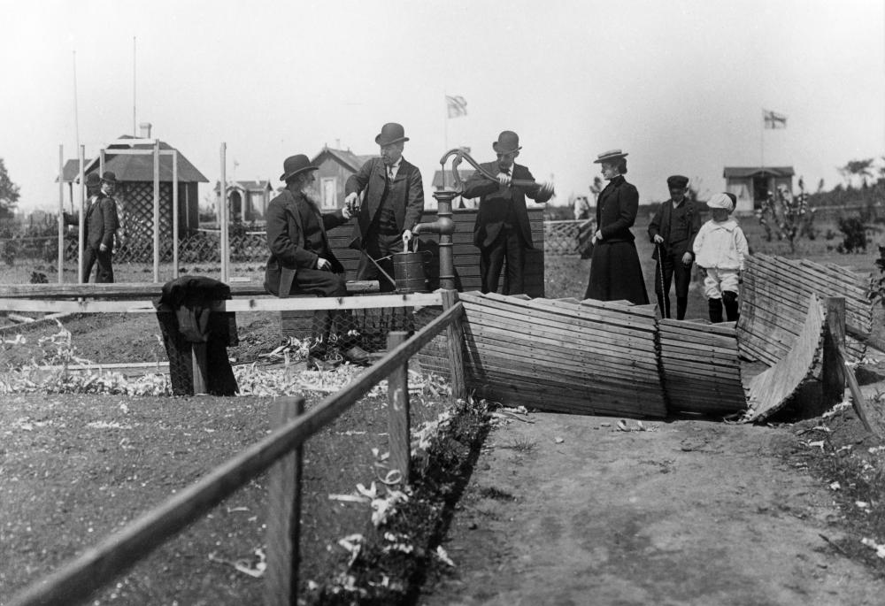 Modern kopia av svartvitt fotografi taget 1907. Bilden visar koloniträdgårdar i Wilson park/Viskängen. Tre män, en kvinna och två pojkar befinner sig intill en vattenpump. En av männen står vid pumpen och fyller vatten i en vattenkanna. En annan sitter på en bänk intill. I Förgrunden syns en grusgång och en låg inhägnad. I bakgrunden syns några kolonistugor och ytterligare två män som ser ut att bygga någon form av pergola. Två flaggstänger, med flaggor i topp, syns också i bakgrunden.
