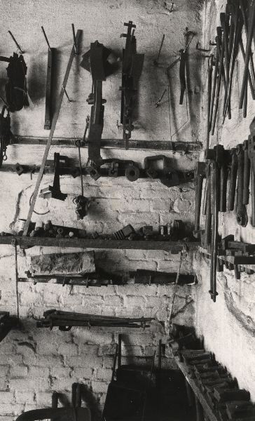 Bild av Enoch Nilssons verktyg som hänger på väggen i verkstaden.