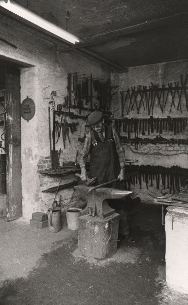 Bild av Enoch Nilsson som står och arbetar vid städet.
