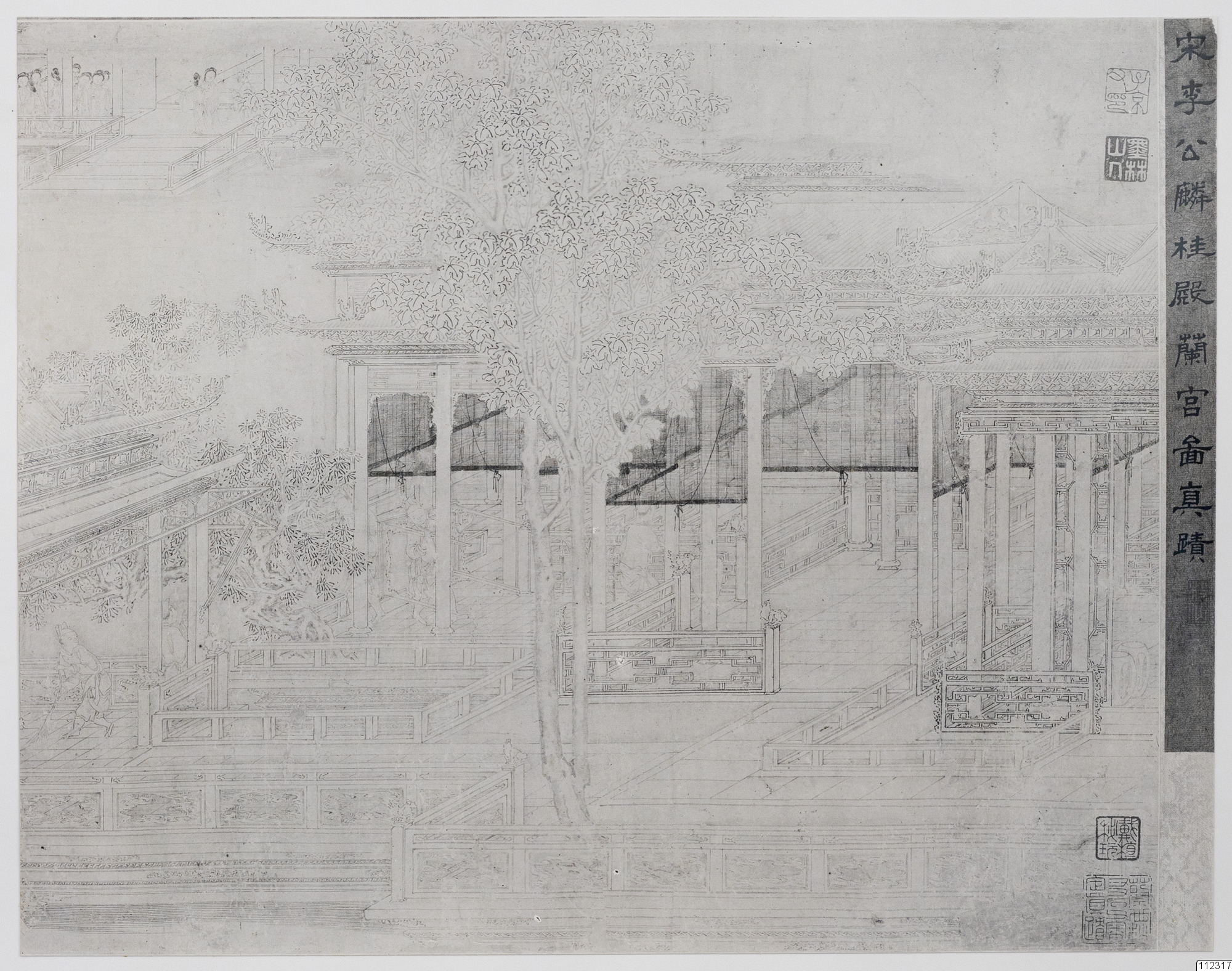 Konstverk målat av Li Kung-Lin som avbildar en utsikt över ett kejserligt sommarpalats.