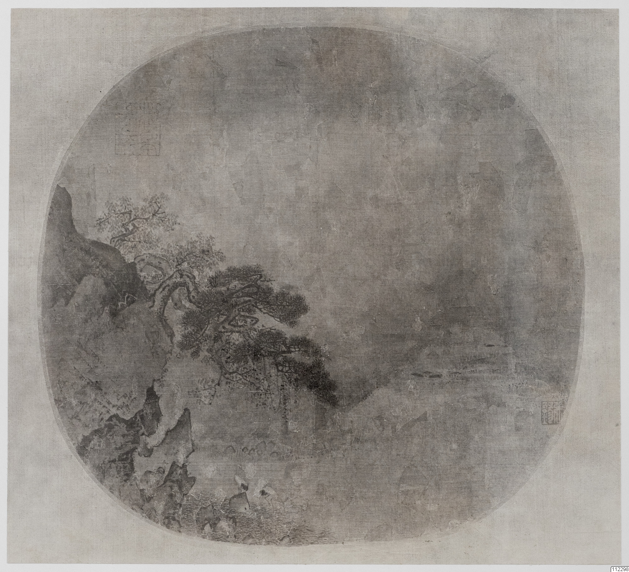 Konstverk målat av Liu Sung-Nien som avbildar två storkar under en överhängande tall.