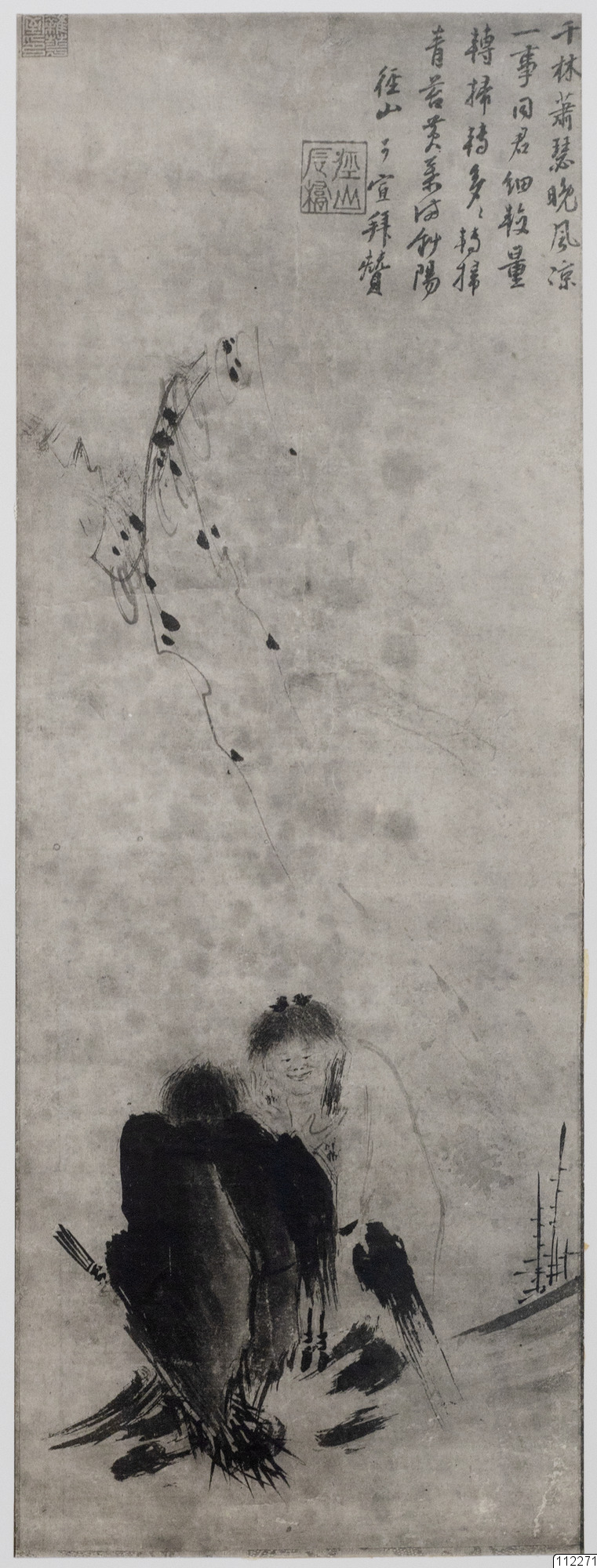 Konstverk målat av Ma Lin som avbildar Han-Shan och Shih-te, och dikten är skriven av Ching-Shan.