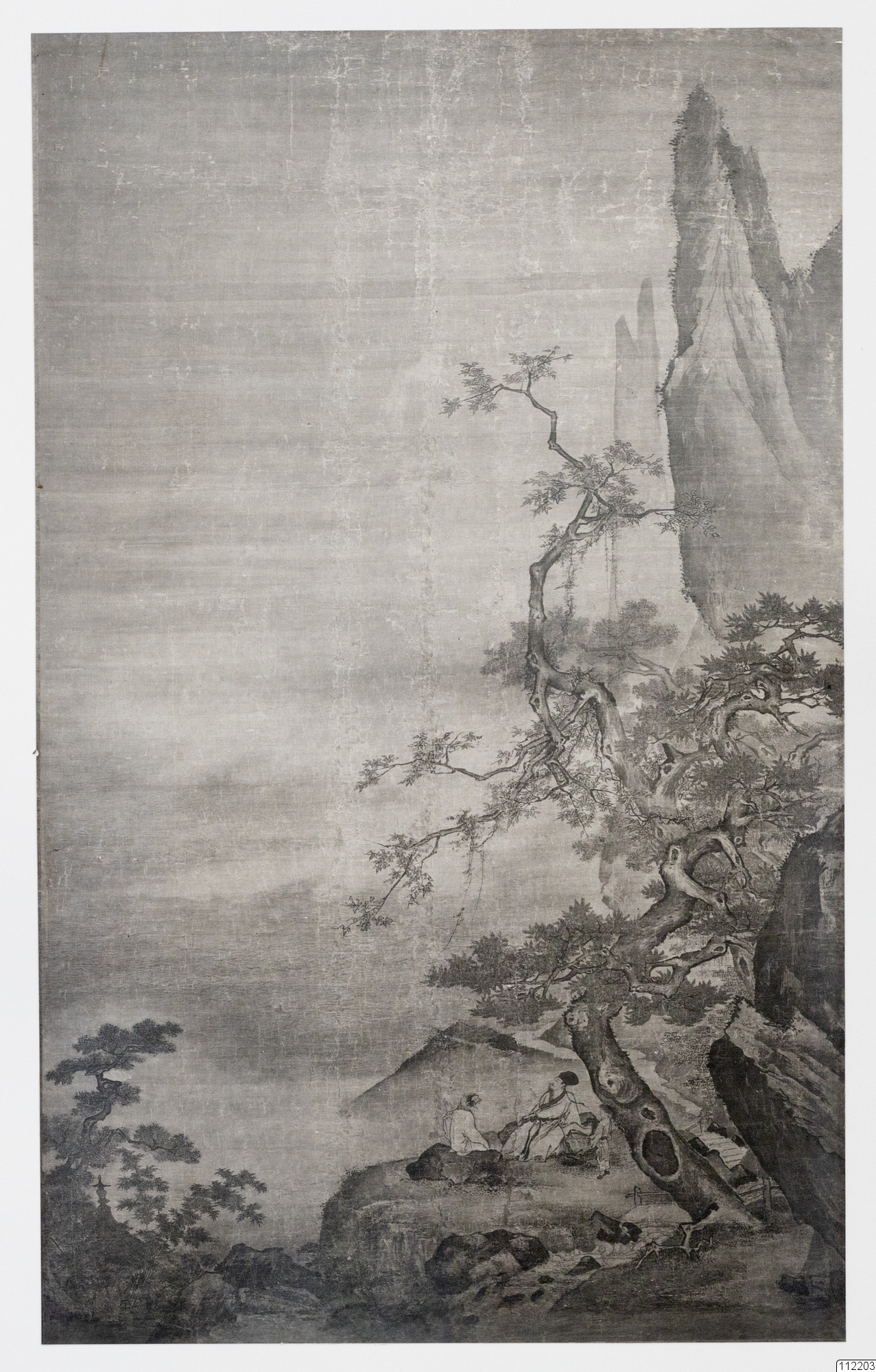 Konstverk målat av Ma Yuan som avbildar tre personer som tittar på bergen.