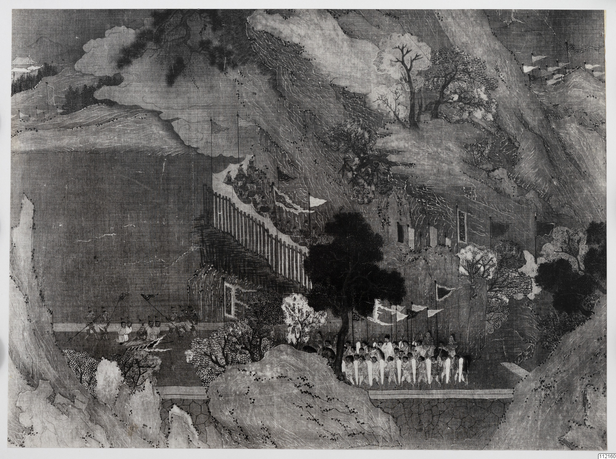 Konstverk målat av Chao Po-Chu. Den förste Han-kejsarens intåg i Kuan-Chung. Signerad handskrift. I hans sätt. Detalj.