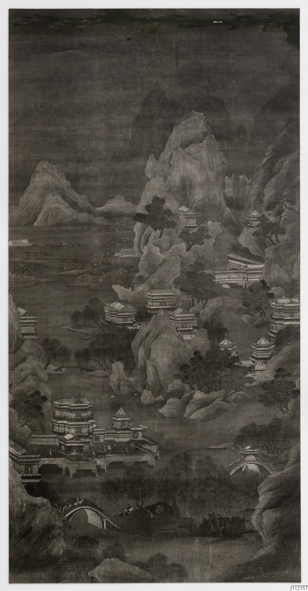 Konstverk målat av Chao Po-Chu. Bergslandskap med byggnader. I hans stil.