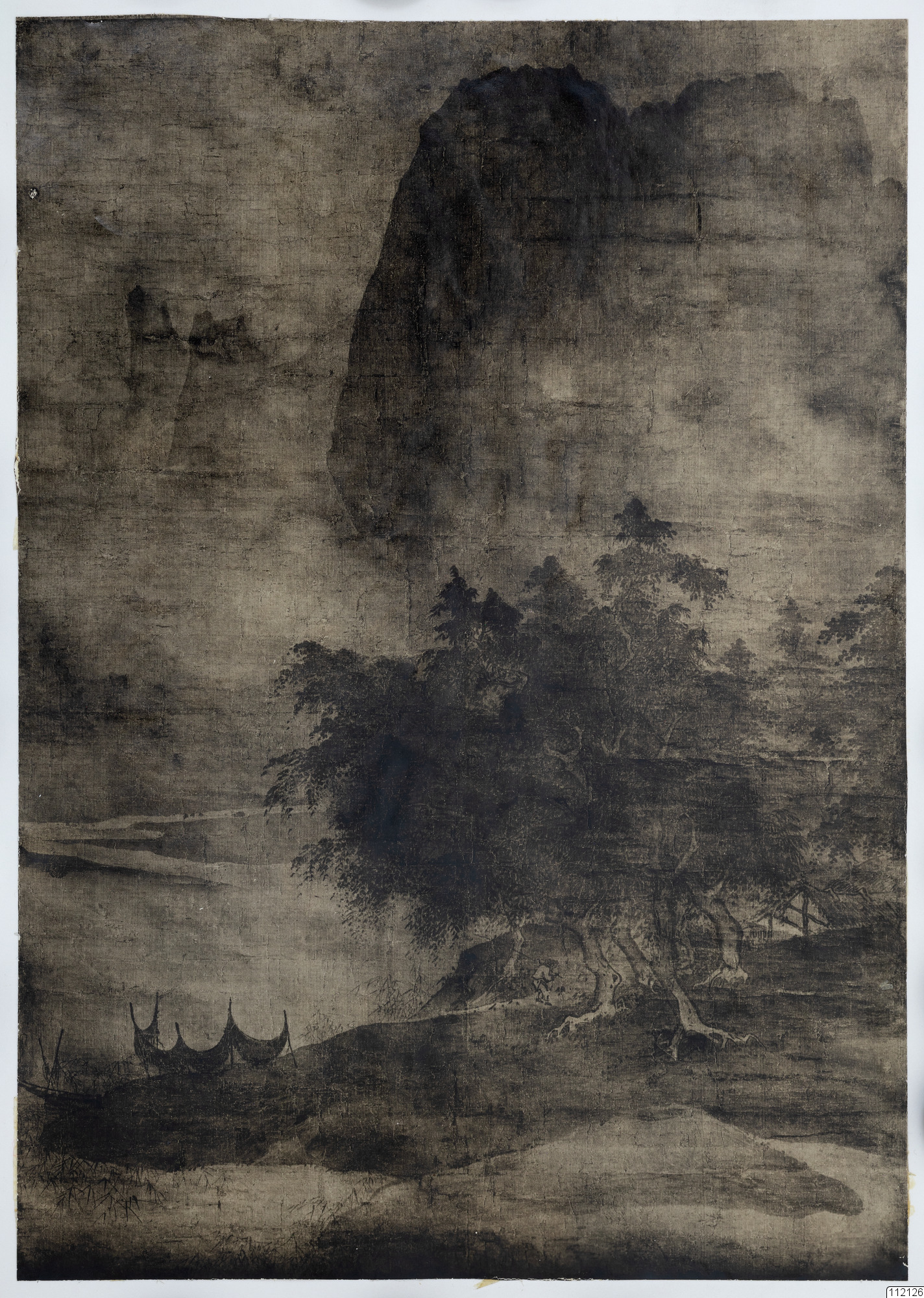 Konstverk målat av Hsia Kuei. Landskap med fisknät och en grupp stora träd vid flodstranden. I stil av Hisa Kuei.