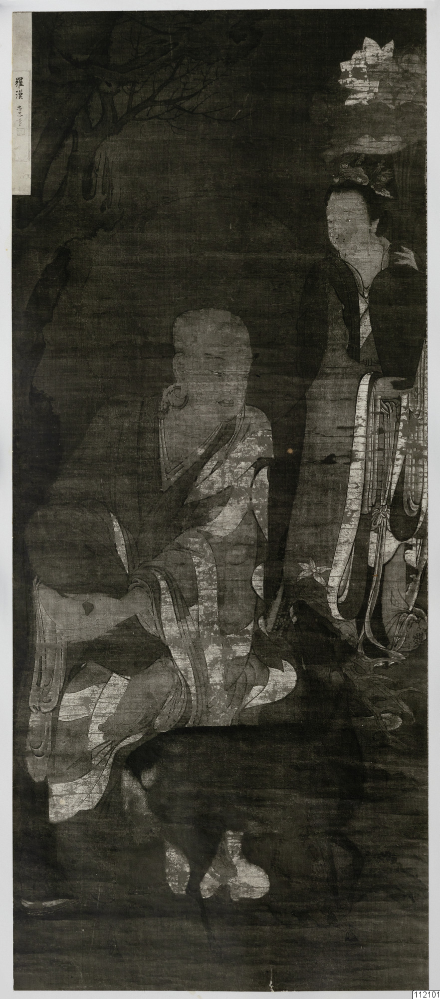 Konstverk målat av Li Kung-lin. Arhat med medhjälpare. Ena målningen av ett par. Sen Sung, men inte målad på mästarens vis. Hängande bindning, färgning (bläck) på siden.