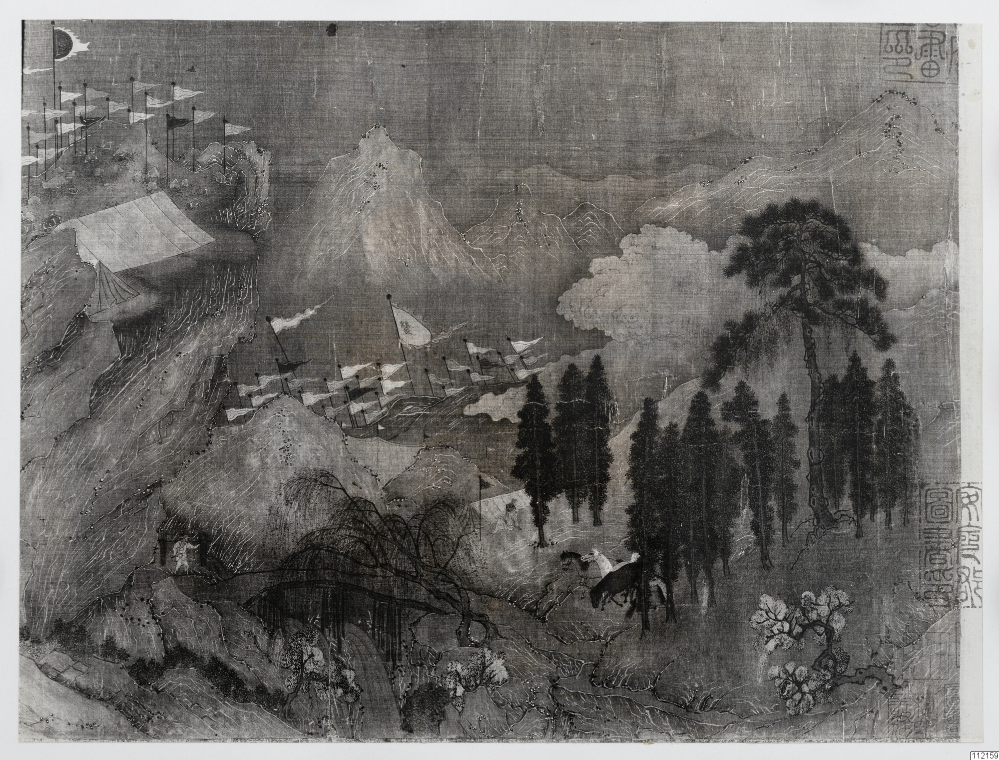 Konstverk målat av Chao Po-Chu. Den förste Han-kejsarens intåg i Kuan-Chung. Signerad handskrift. I hans sätt. Detalj.
