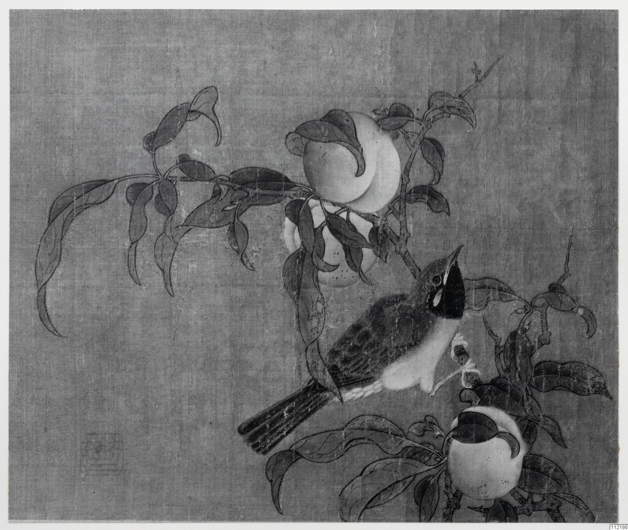 Konstverk målat av Li Chih. Fågel på en aprikosgren. Albumblad, färg på siden.