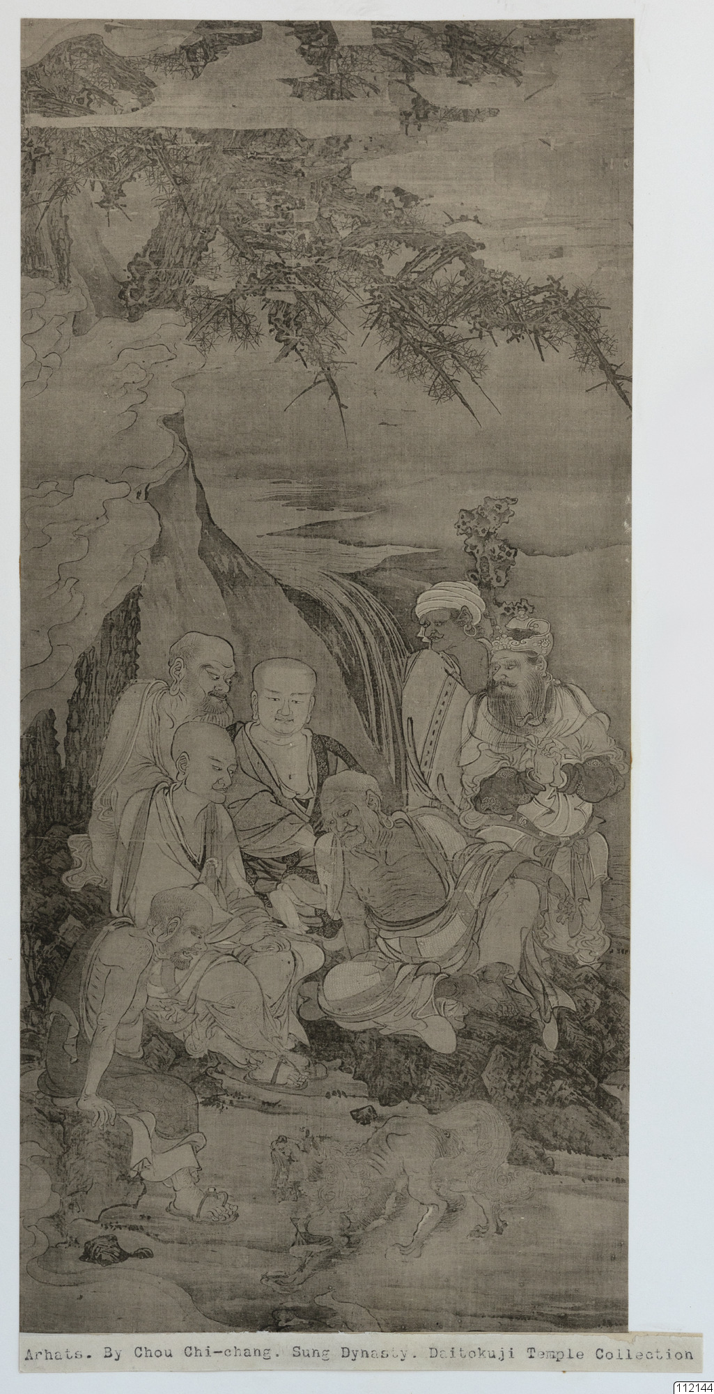 Konstverk målat av Chou Chi-ch'ang. Fem arhater och två medhjälpare med ett lejon.