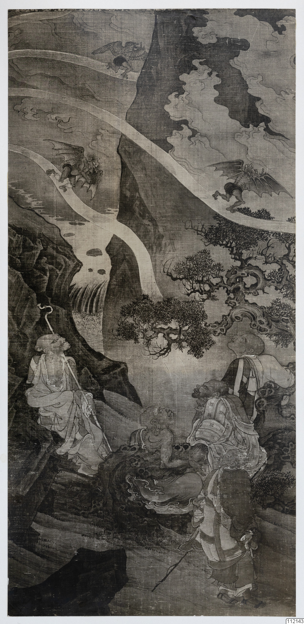 Konstverk målat av Chou Chi-ch'ang. Fem arhater tittar på demoner som bär Buddhas ben till olika delar av världen.