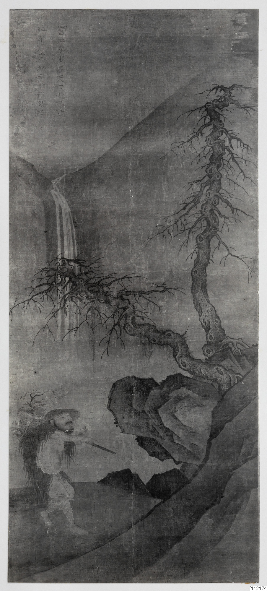 Konstverk målat av Li Ch'eng. Gräsplockare i ett landskap. Ming-målning i hans stil.