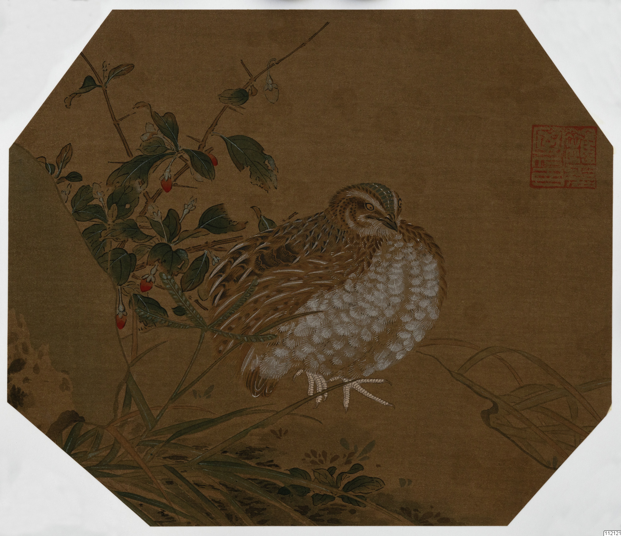 Konstverk målat av Li An-Chung. En vaktel som står vid en buske. Solfjädermålning.