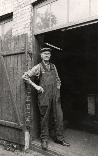 Bild av Enoch Nilsson som står i dörröppningen till sin verkstad. Bilden är tagen inifrån gården.