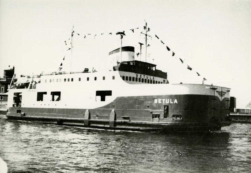 Svartvitt fotografi av S/S Betula på väg in i Helsingborgs hamn. I bakgrunden, till vänster i bild, skymtar Fyrhuset på Parapeten.