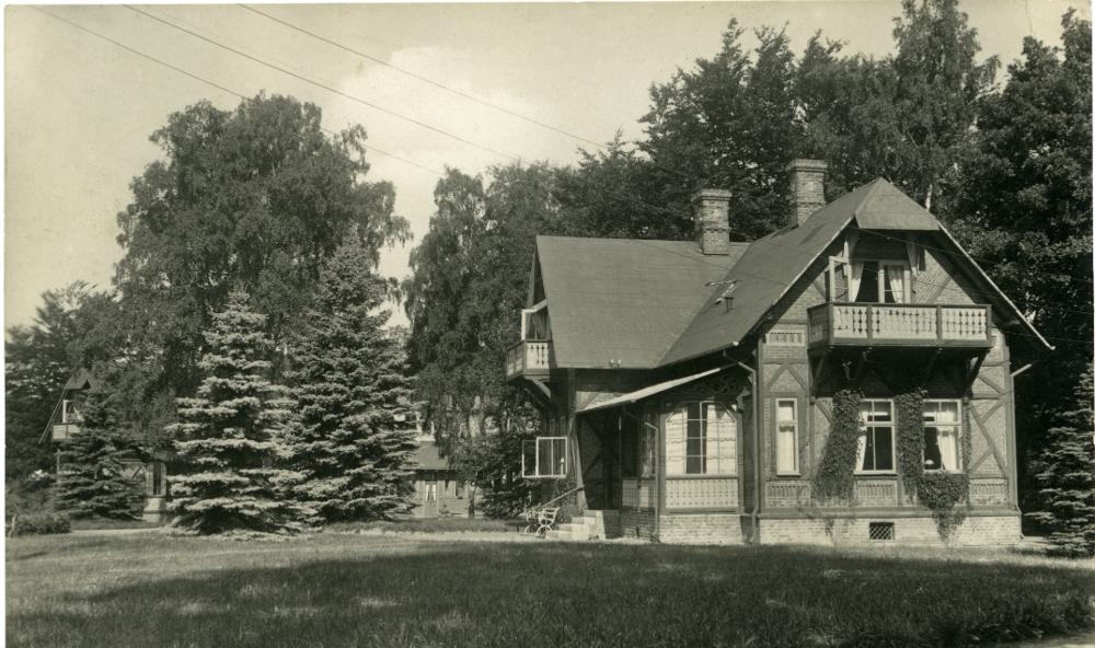Svartvitt fotografi föreställande en villa i Ramlösa brunnspark.