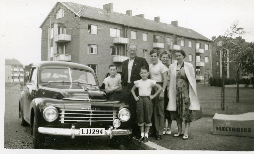 Svartvit bild från början av 50-talet. Familjen Andersson står uppställda utanför hemmet på Jönköpingsgatan 39 a. De står bredvid en svart Volvo som är Henry Dunkers tjänstebil. Pappa Karl Eric, som arbetade på gummifabriken, var tidvis chaufför åt Henry Dunker. När det fanns väntetid mellan körningar fick Karl Eric använda bilden för att köra en tur med familjen. Från vänster står, Bo, Karl Erik, Per-Erik, Lars-Erik, Birgitta och Orra.