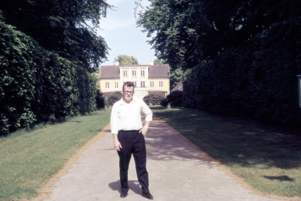 Färgbild föreställande Bo Arne Andersson, fotograferad på Fredriksdal framför herrgården. Det är sommar och solen skiner, Bo Arne har uppkavlade skjortärmar.