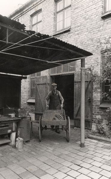 Bild av Enoch Nilsson som kör en skottkärra på gården.