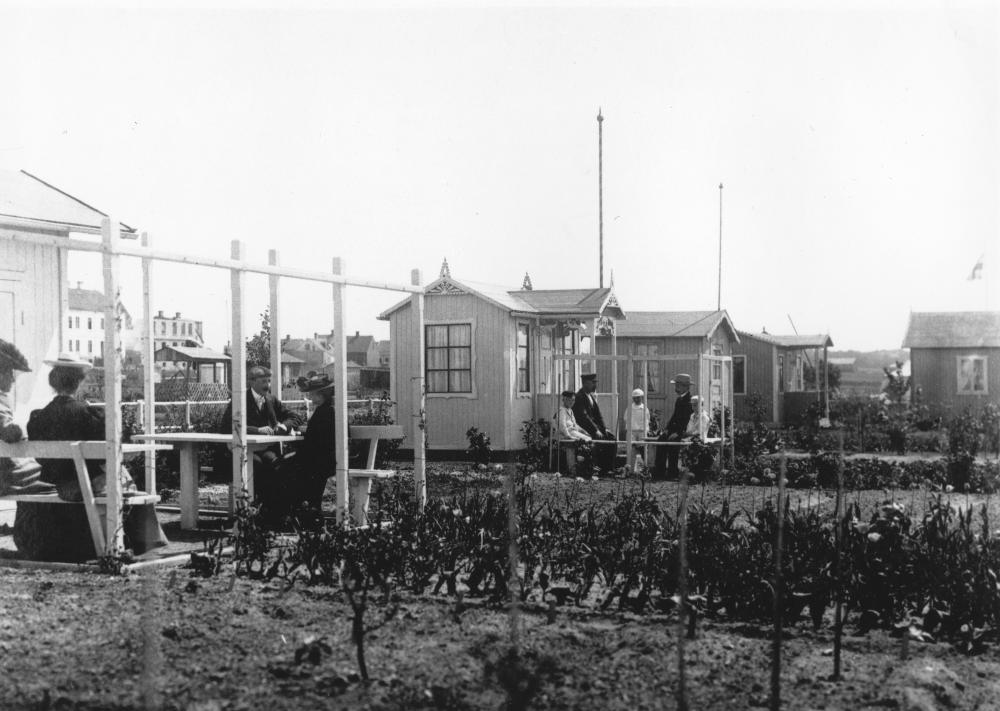 Modern kopia av svartvitt fotografi taget 1907. Bilden visar koloniträdgårdar i Wilson park/Viskängen. Fyra stugor ligger på rad sett från fotografiets vänstra kant. Framför två av dem sitter ett antal personer på bänkar på uteplatser. Intill två av stugorna står flaggstänger. I bakgrunden, mellan stugorna, syns en del stadsbebyggelse.