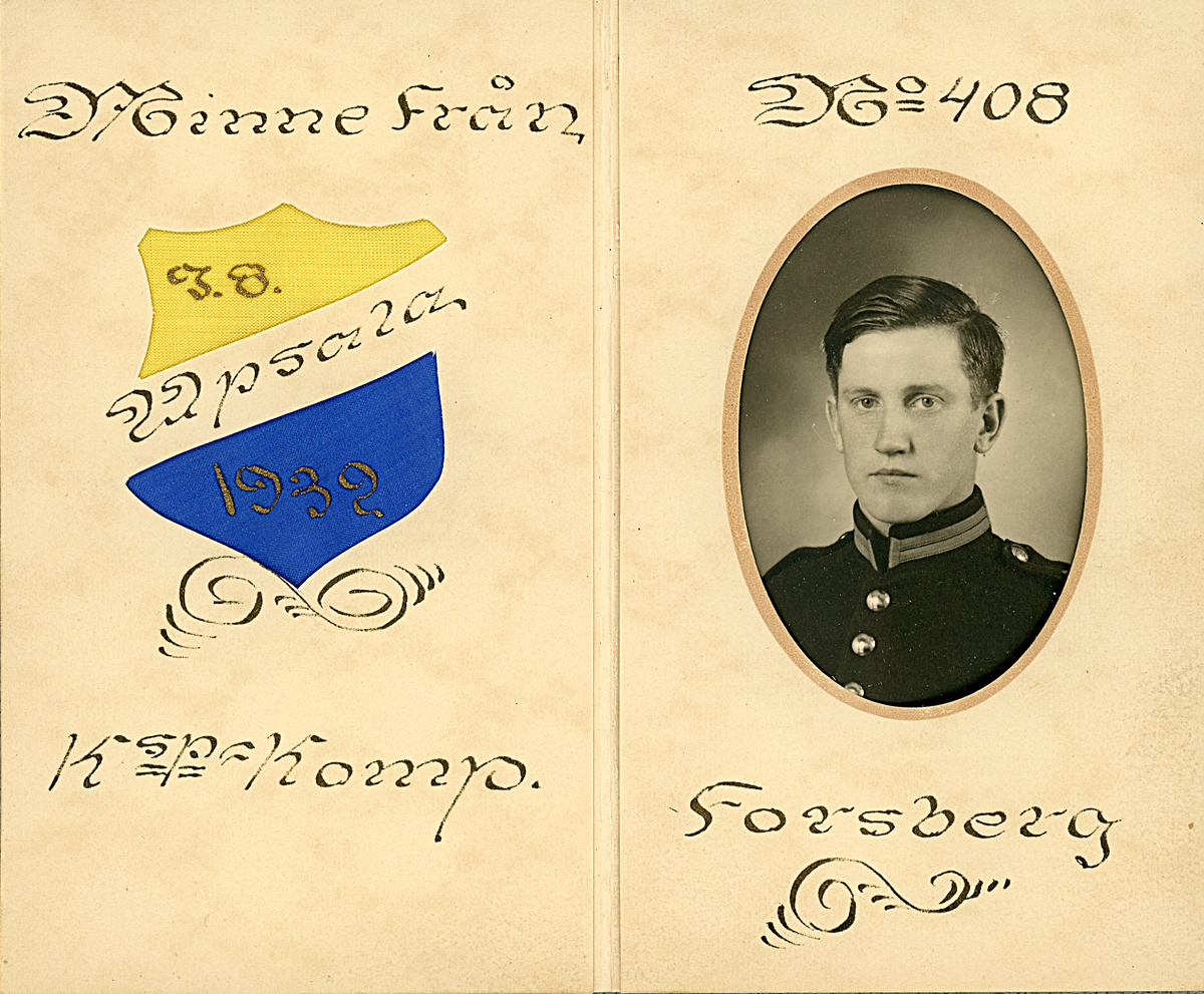 Minne från en specifik tidpunkt, troligen militärtjänst med handskrivna detaljer och ett porträttfoto. Text på kort: "Minne från Uppsala 1932, Ksp-komp. No 408 Forsberg".