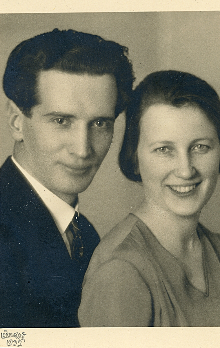 Porträtt av ett par. Signatur på kortets framsida, troligen fotografens, Lönnqvist 1932.