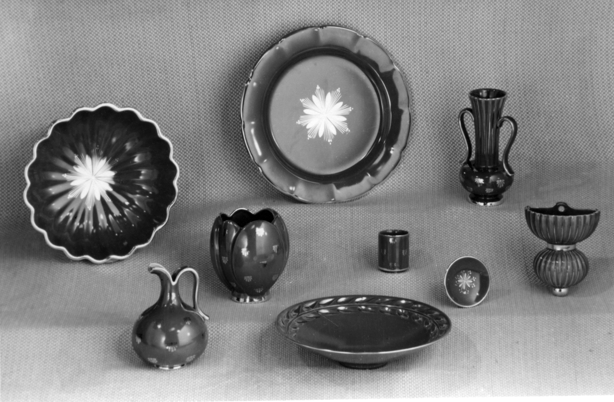 Dekor "Rubin" Skaparen chefdekoratör EugenTrots var anställd på Gefle Porslin AB 1922-1963. Dekoren som var i produktion 1940-1958, består av handmålade spridda guldornament på bränd rubinröd glasyr.