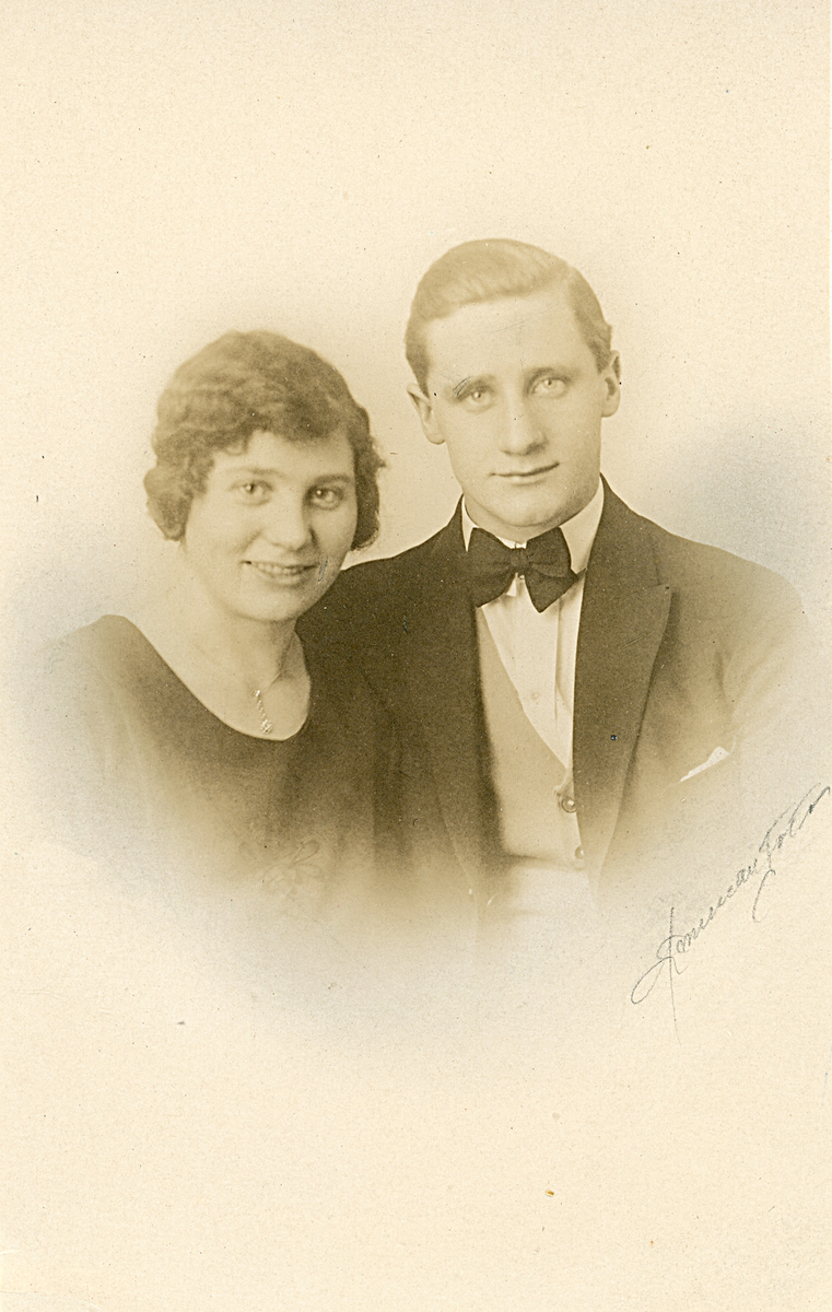 Porträtt av man och kvinna. Signatur till höger på kortets framsida är troligen fotografens (svårtydd text ... Foto).