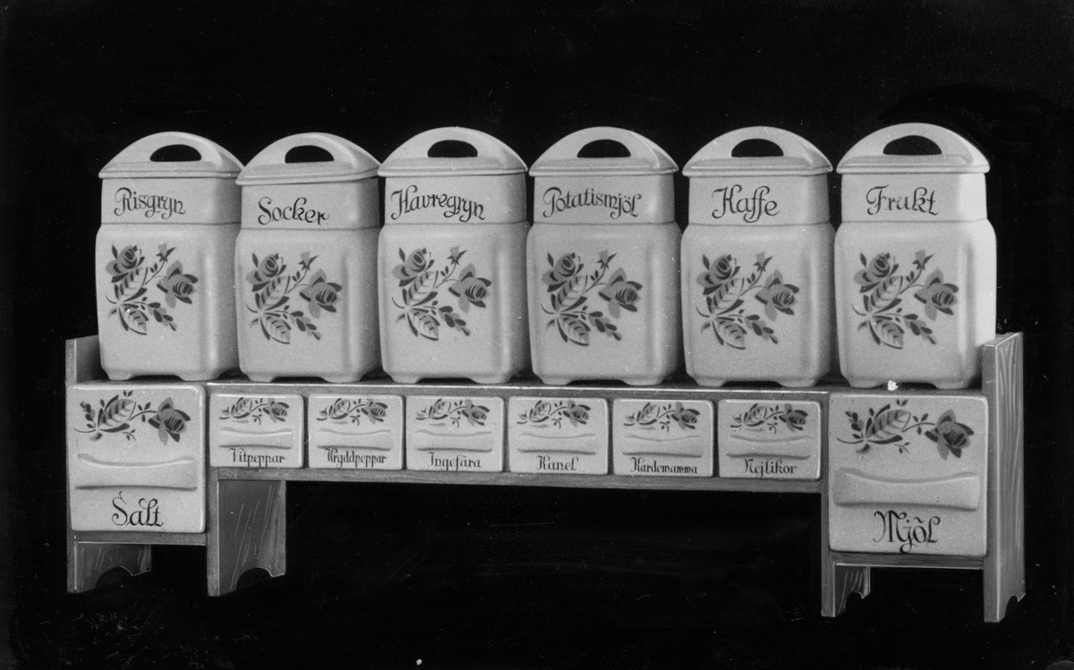 Kryddhylla med kryddburkar.