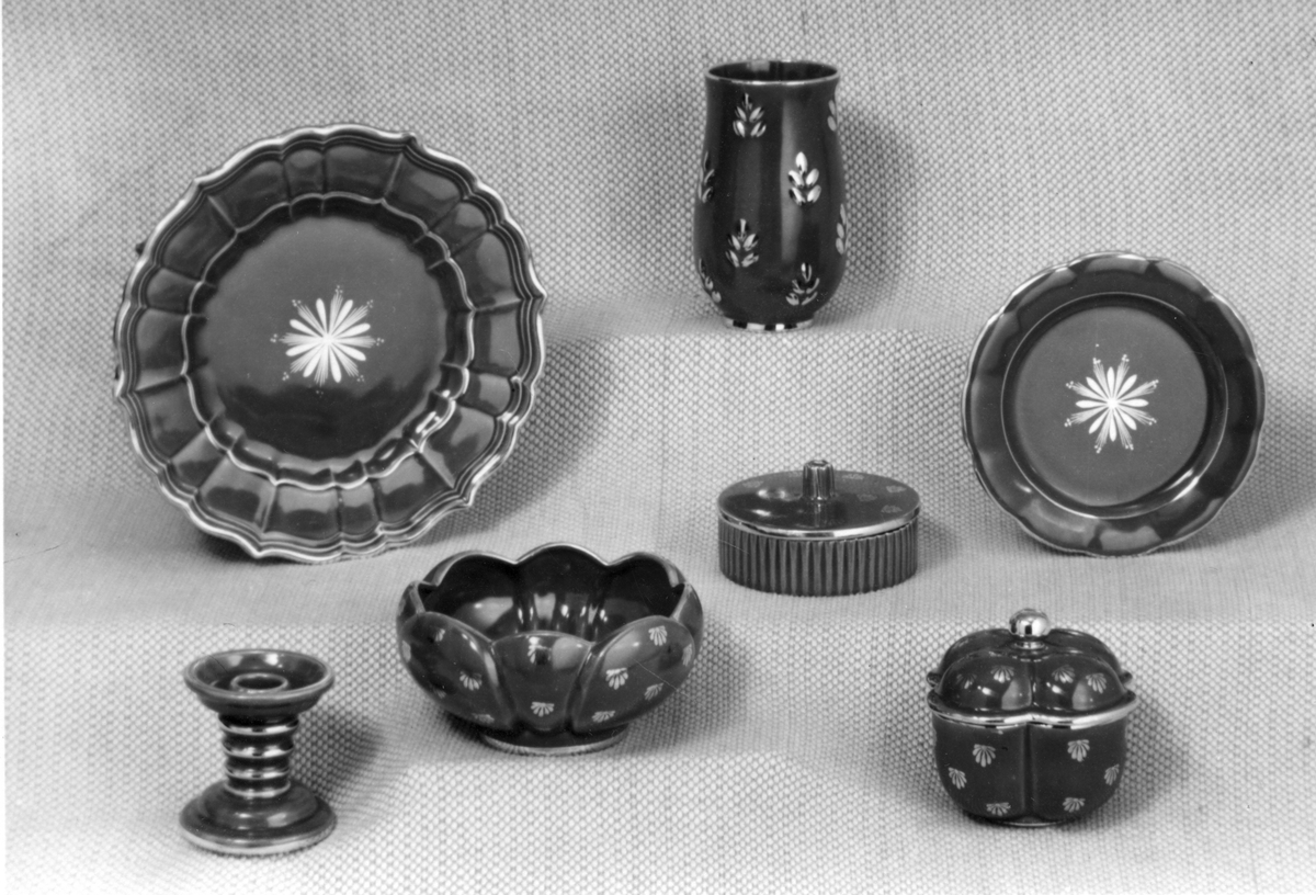 Dekor: Rubin, skaparen var chefdekoratör Eugen Trots, anställd på Gefle Porslin 1922-1963. Dekoren var i produktion 1940-1958,