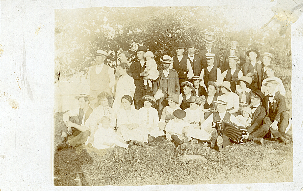 Bild av en grupp människor, män, kvinnor och barn, som poserar i gräset, verkar vara någon speciell sammankomst.